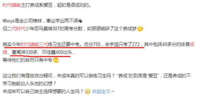 當(dāng)馬嘉祺成績曝光后,時(shí)代峰峻發(fā)文撇清關(guān)系,暗示他們總體成績還算合格,只有馬嘉祺一個(gè)例外。可近日卻有消息曝出,三代中考成績也出了問題,總分750的考試,余宇涵只考了272,其實(shí)還包括40多分的體育成績,董禹坤330多分,鄧嘉鑫400剛出頭。