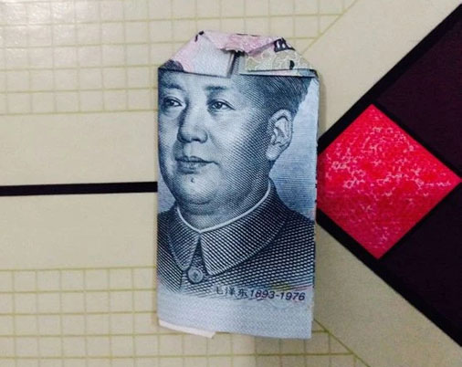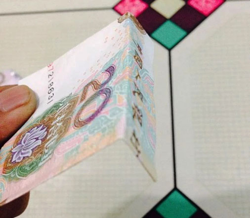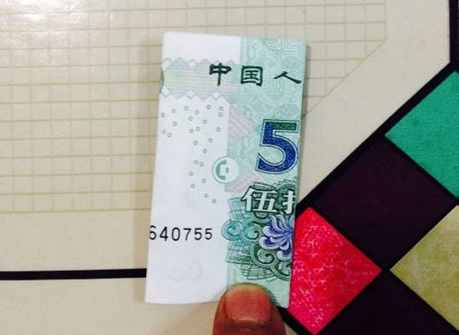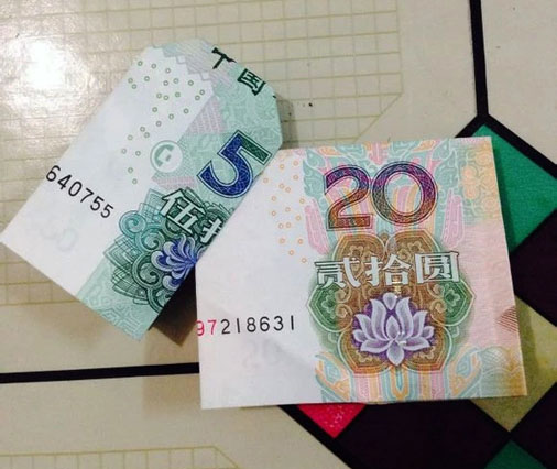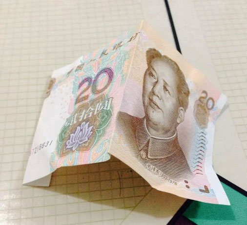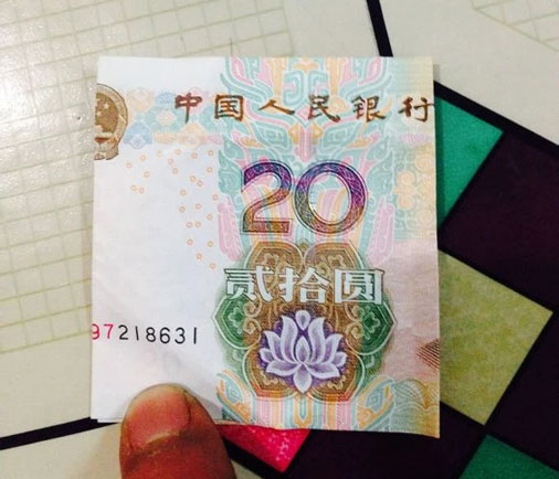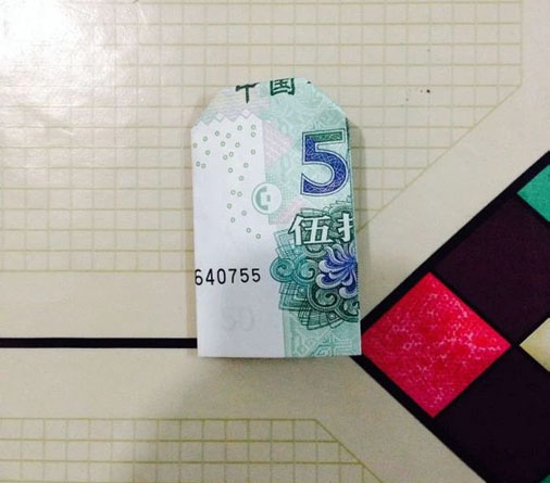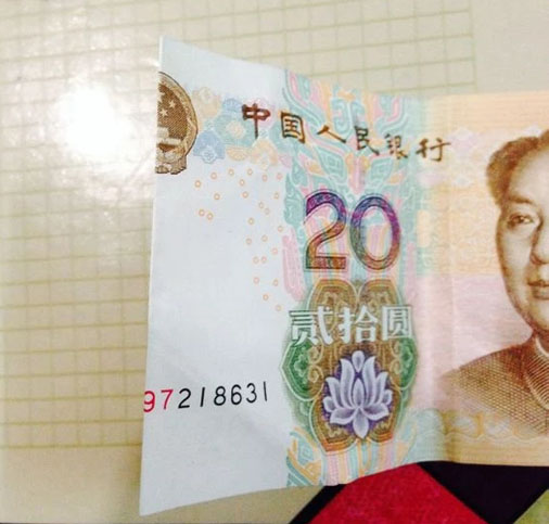 步驟11:接下來,我們拿出準備好的20元,在國徽的中間位置對折下來。