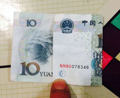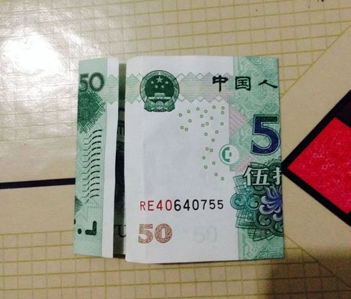 步驟8:拿出一張10元,步驟和50元的相同,1和0之間對折,(看看反面,讓0可以剛好完整的露出來最合適)