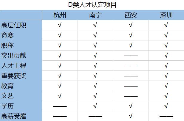 評定各級高層次人才的條款非常多,由于篇幅有限,這里我們只能將條款簡單的進行一個分類,然后結(jié)合前面例子中所涉及的城市杭州(新一線城市)、南寧(二線城市),再增加兩個熱門對比城市深圳(一線城市)、西安(新一線城市),為大家簡要介紹一下D類、E類高層次人才。