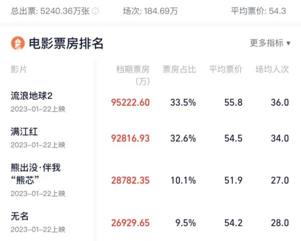 截至1月23日20時51分,《流浪地球2》、《滿江紅》在上座率、場均人次數(shù)據(jù)上,《滿江紅》分別以44.6%和59.6反超《流浪地球2》的37.1%和56.9。