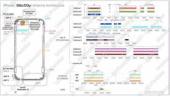 該文檔來自研究人員和爆料人士 Unknownz21,其中包含 iPhone 15 天線架構(gòu)的圖表。D8x 指的是 iPhone 15 Pro 機(jī)型,信息表明更快的 Wi-Fi 6E 規(guī)格將僅限于 iPhone 15 Pro 和 iPhone 15 Pro Max。
