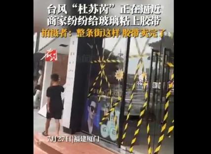 7月27日,隨著臺風“杜蘇芮”逐漸逼近福建廈門,商家們紛紛行動起來,給門窗玻璃粘上膠帶以防止破碎。據拍攝者稱,整條街都采取了這種防護措施,而由于需求激增,膠帶甚至出現了脫銷的情況。