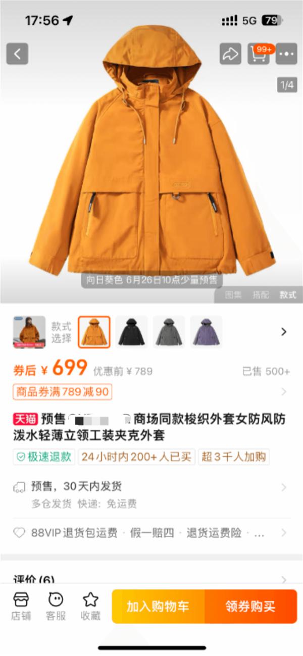 在電商平臺上,該款沖鋒衣因劉亦菲的穿著而大受歡迎,這款沖鋒衣券后官方售價 699 元,同色庫存顯示全尺碼斷貨。