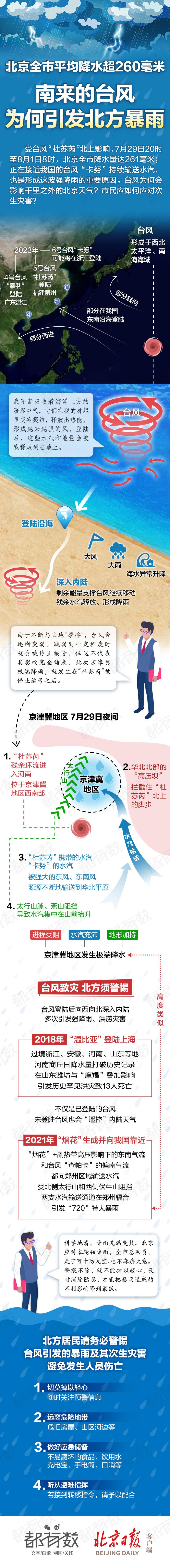 受臺風“杜蘇芮”北上影響,7月29日20時至8月1日8時,北京全市降水量達261毫米;正在接近我國的臺風“卡努”持續輸送水汽,也是形成這波強降雨的重要原因。臺風為何會影響千里之外的北京天氣?市民應如何應對次生災害?