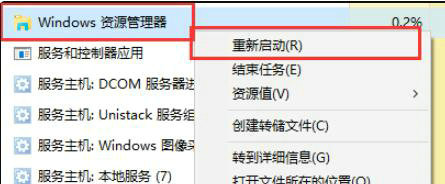 7、最后打開我們的任務管理器,找到其中的“資源管理器”,右鍵選擇“重新啟動”即可。